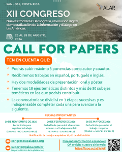 ALAP se enorgullece en anunciar el próximo XII Congreso, titulado “Nuevas fronteras: Demografía, revolución digital, democratización de la información y diálogo en las Américas”. Este evento, programado del 26 al 28 de agosto de 2025 en San José – Costa Rica, promete ser un espacio de intercambio intergeneracional y de encuentro entre los distintos centros de conocimiento demográfico dentro y fuera de la región.