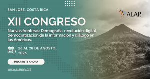 ALAP se enorgullece en anunciar el próximo XII Congreso, titulado “Nuevas fronteras: Demografía, revolución digital, democratización de la información y diálogo en las Américas”. Este evento, programado del 26 al 28 de agosto de 2025 en San José – Costa Rica, promete ser un espacio de intercambio intergeneracional y de encuentro entre los distintos centros de conocimiento demográfico dentro y fuera de la región.