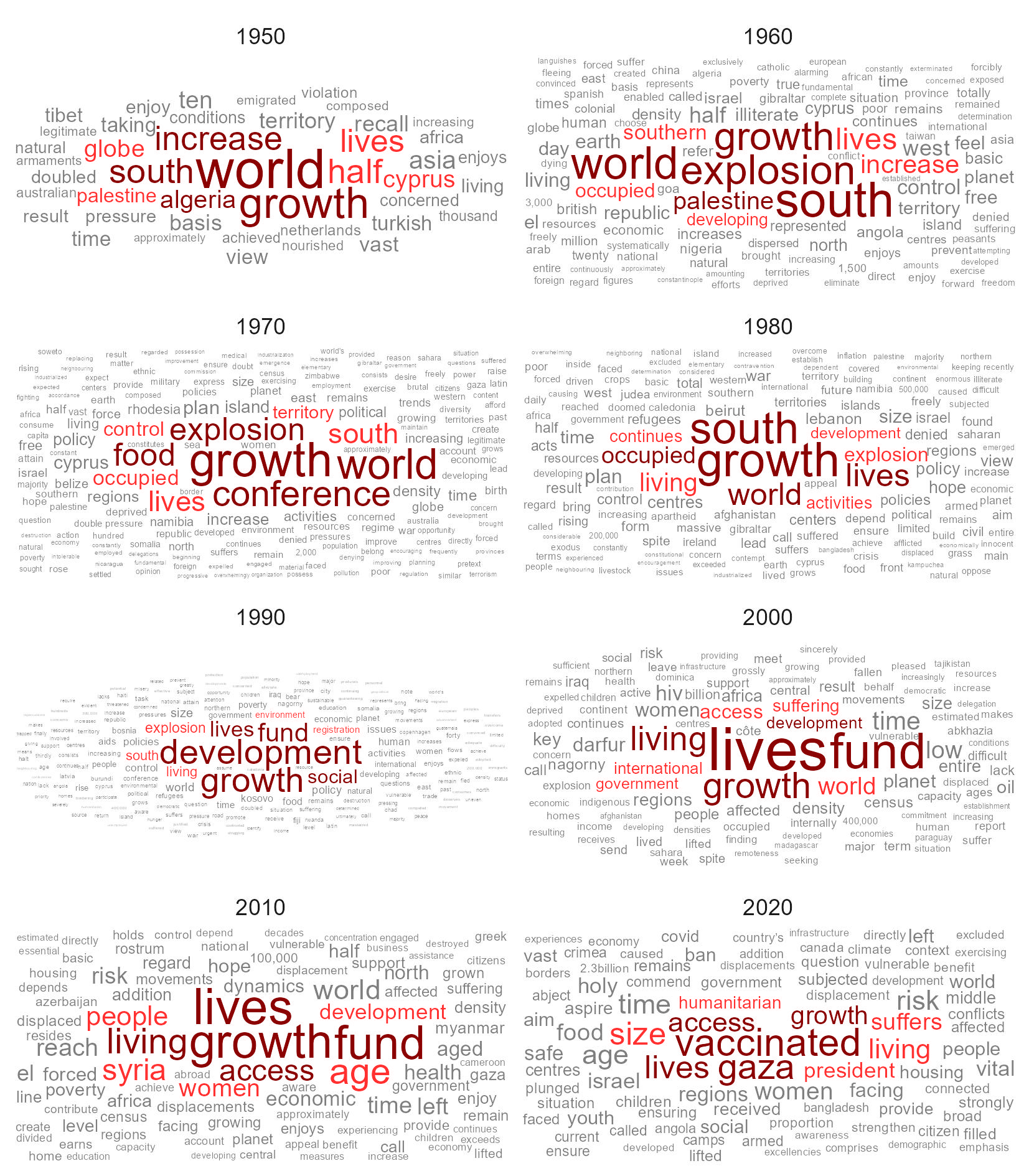 En el Gráfico 1, se observa las palabras vinculadas al término “población” en los debates generales de la Asamblea Generale de NNUU a lo largo de las décadas. En la década de 1950, la principal preocupación fue el crecimiento poblacional, en un contexto de un incremento demográfico posterior a la Segunda Guerra Mundial. La discusión sobre el incremento de la población en esta década, que Paul Demeny considera que inicialmente ocurrió en países de occidente, se daba en un contexto de una tasa de crecimiento global aproximada del 2%, crecimiento motivado por una reducción de la mortalidad en las últimas décadas, un notable incremento de la fecundidad en el periodo de la postguerra, y el consecuente nacimiento de cohortes de gran tamaño, al que se los conocería como baby boomers. La aparición de este tema como el más importante vinculado a la población no solo refleja la preocupación a nivel de los países, sino también la adopción de las primeras políticas e instituciones vinculadas al crecimiento de la población en la postguerra. Otros temas surgen en la década vinculado al término población, en particular las guerras de independencia de Algeria y Chipre y el conflicto en Palestina.